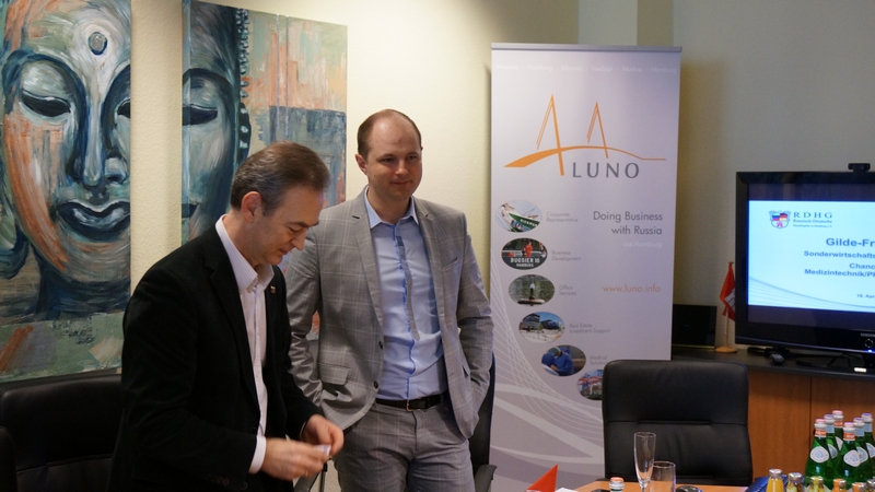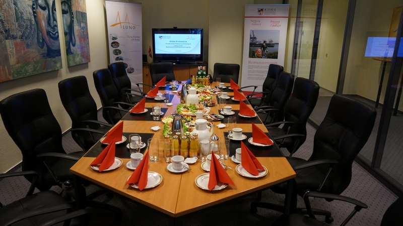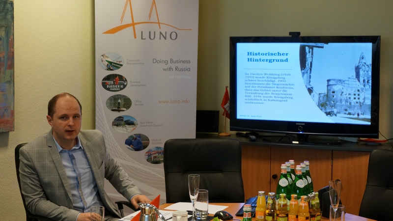 Am 16. April 2018 lud die Gilde in die Geschäftsräume der LUNO-Gruppe zum Business-Frühstück ein. Mit diesem neuen Eventformat soll künftig regelmäßig die Möglichkeit gegeben werden, sich beim Start in den Tag über ein interessantes Russland-Thema zu informieren und dabei in entspannter Atmosphäre untereinander auszutauschen. Referent war Alexander Belyashov, stv. Leiter der Abteilung für Internationale Wirtschaftsbeziehungen in der IHK Kaliningrad. Er berichtete über die Sonderwirtschaftszone Kaliningrad und zeigte dabei die Chancen und Potenziale für Medizintechnik, Pharmazie und Logistik auf.