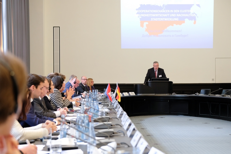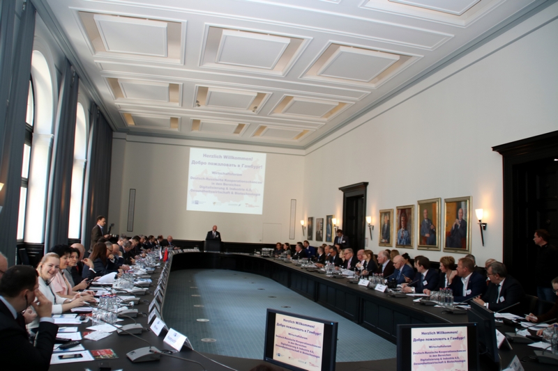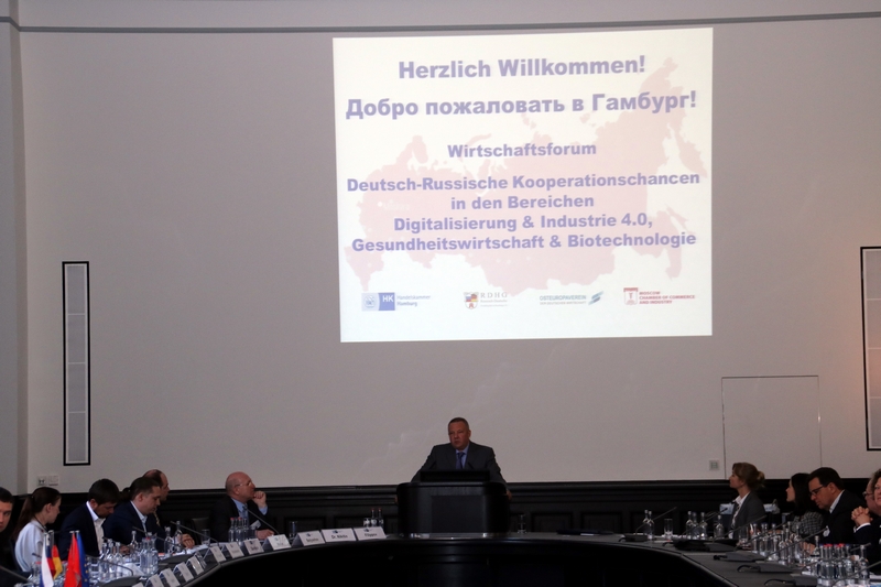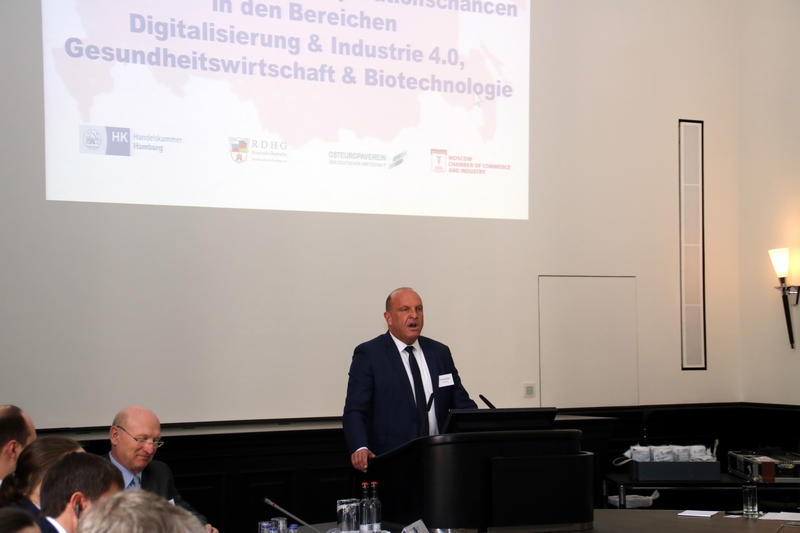 Mit knapp 100 Teilnehmern war der Plenarsaal der HK Hamburg gefüllt und erneut gelebte Informations- und Kontaktplattform für die Gildemitglieder. Das Wirtschaftsforum Moskau zu Digitalisierung/Industrie 4.0 und Gesundheitswirtschaft wurde von der RDHG gemeinsam mit den Handelskammern Hamburg und Moskau und dem Osteuropaverein anl. des Aufenthaltes einer russischen Wirtschaftsdelegation unter Leitung von Vladimir Platonov, Präsident der Moskauer IHK, durchgeführt. Ein voller Erfolg mit zahlreichen B2B-Kontakten und Netzwerken für das Geschäft mit Moskau und Russland!