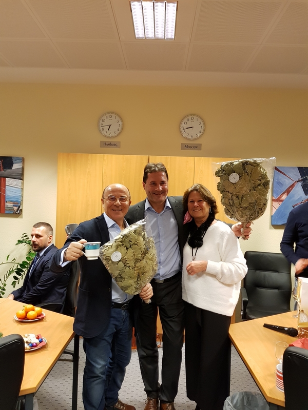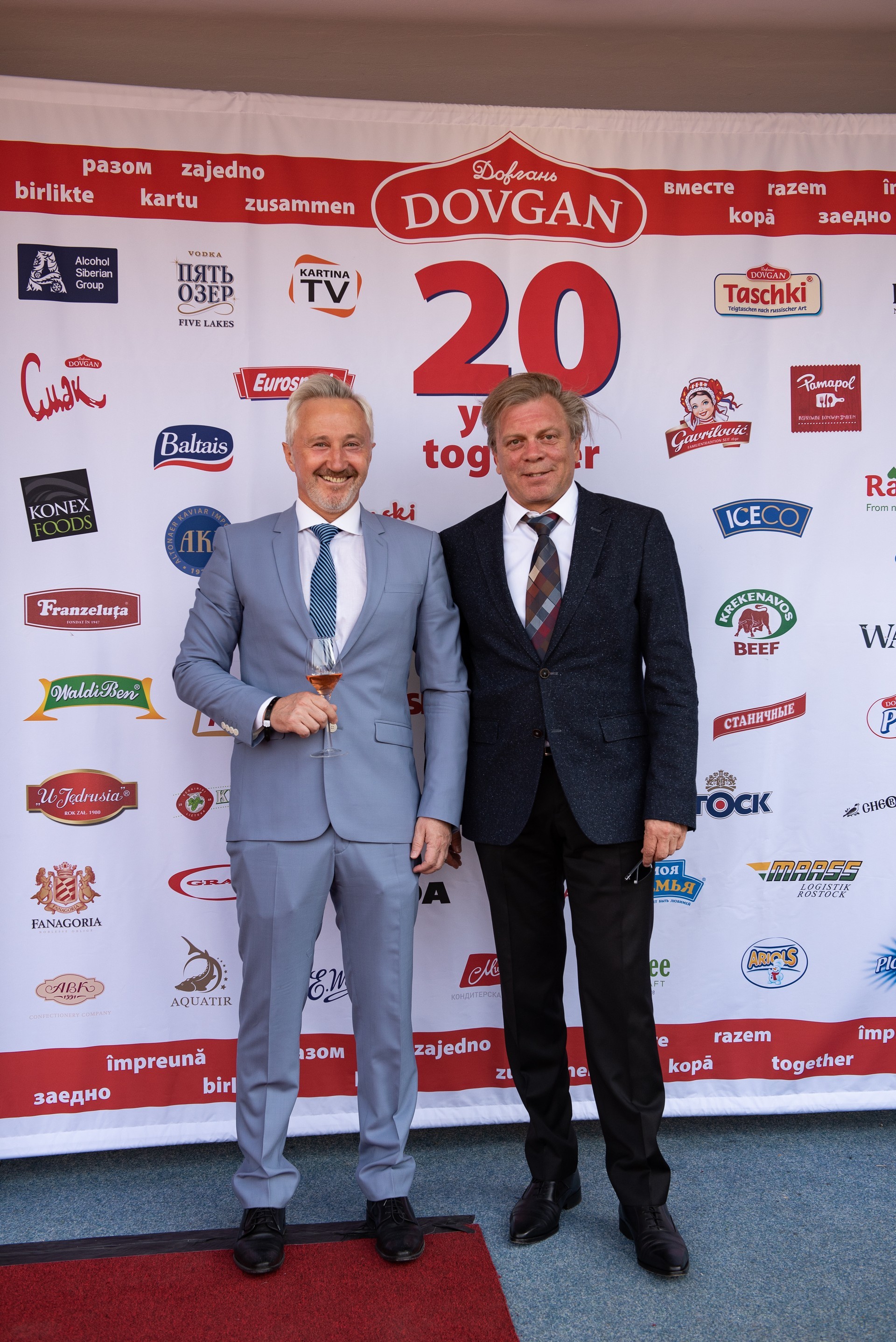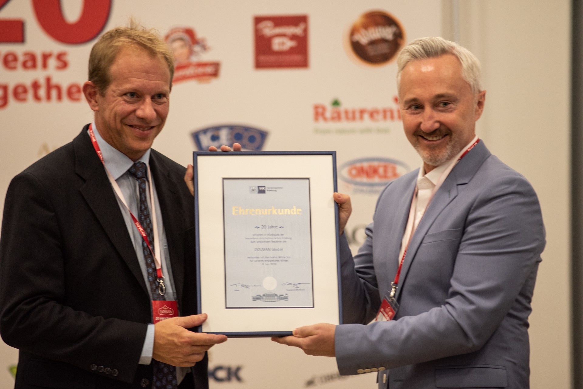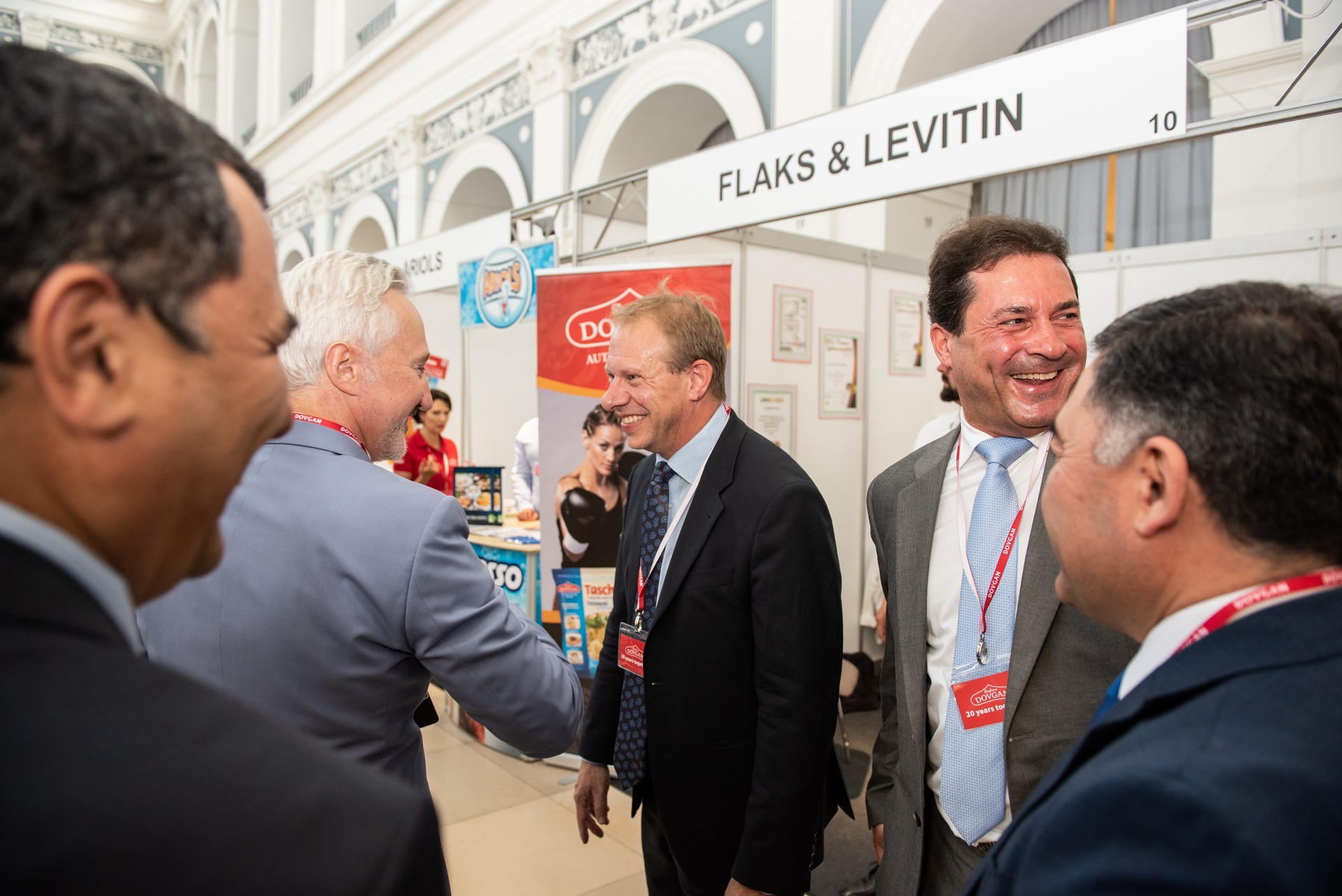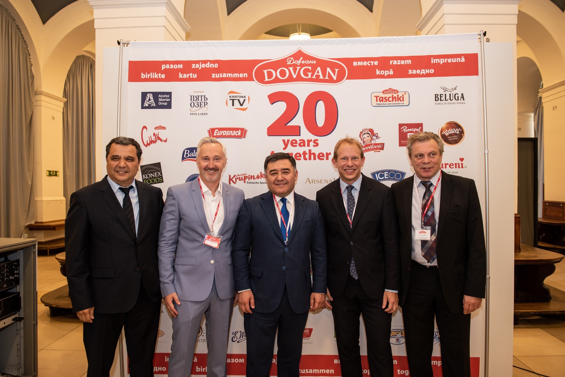 Unser Gründungsmitglied und langjähriger stellvertretender Vorsitzender André Kowalew feierte mit seiner DOVGAN GmbH das 20-jährige Firmenjubiläum! André hat DOVGAN mit enormem Einsatz und viel Leidenschaft von Null aufgebaut, ist dabei im hart umkämpften deutschen Lebensmittelmarkt oft gegen den Strom geschwommen und hat es geschafft, bei fast allen großen Einzelhandelsketten mit einem breiten Sortiment gelistet zu sein. Sein Brand ist im gesamten Bundesgebiet nicht nur bei den russischstämmigen Bürgern bekannt. Ganz im Gegenteil steht DOVGAN bei vielen Deutschen hoch im Kurs, sind doch das russische Plombir-Eis, Pelmeni, Borschtsch, Salzgurken, eingelegte Tomaten und viele andere Produkte nach Rückkehr von der Geschäftsreise aus Russland beliebte Gerichte, die man auch hier ab und an genießen möchte. Schon längst konzentriert sich DOVGAN nicht mehr nur auf russische Produkte, sondern beliefert die deutschen Ketten mit authentischen Produkten unter TOP-Marken aus Polen, Rumänien, der Adria-Region (Ex Jugoslawien) und dem Orient (Türkei, Libanon, Marokko, Syrien usw.). Diese Markenvielfalt hat DOVGAN im Börsensaal der Handelskammer gemeinsam mit seinen Produzenten aus Russland, Polen, Kroatien, Litauen und Lettland präsentiert. Mit Verkostungen leckerer Produktneuheiten und interessanter Vorträge wurde man in die DOVGAN-Welt entführt. Die Eröffnung der Veranstaltung übernahm der Präses der Handelskammer Hamburg, Tobias Bergmann, der sich anschließend auch einen ausführlichen Rundgang nicht nehmen ließ.