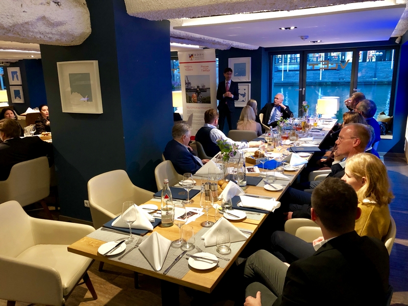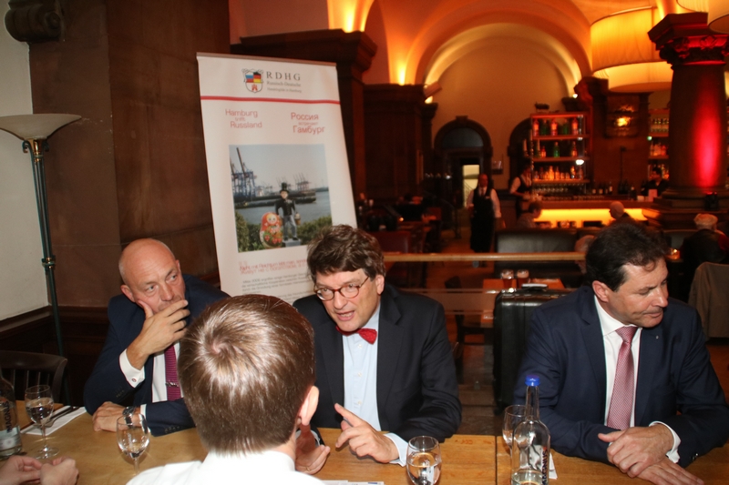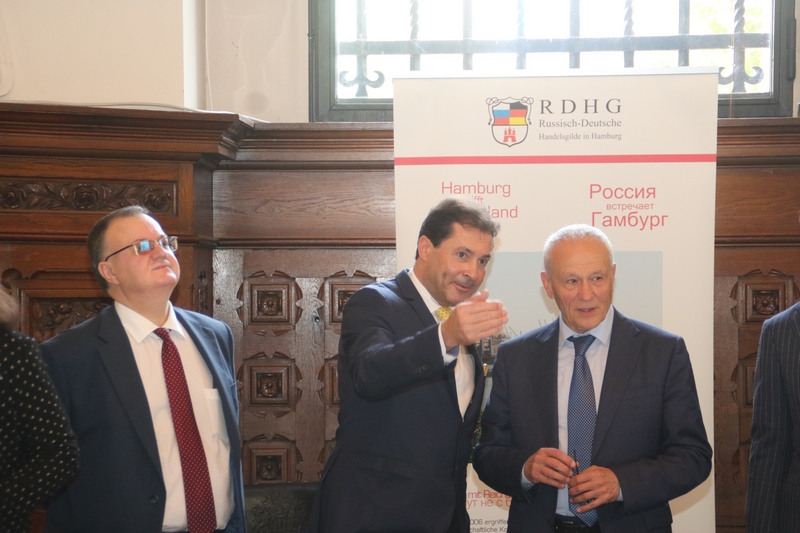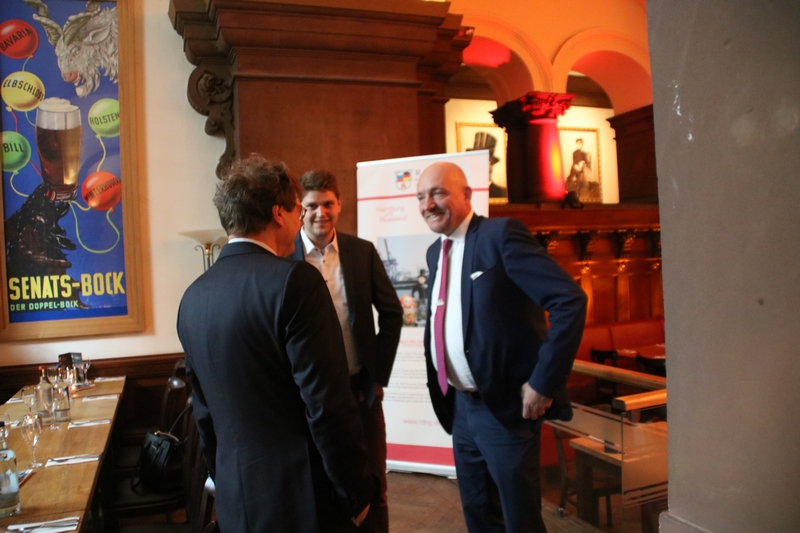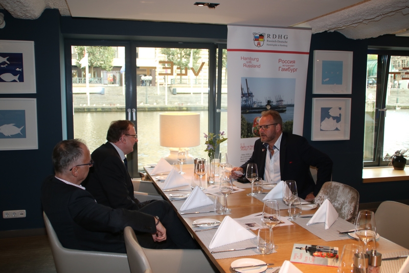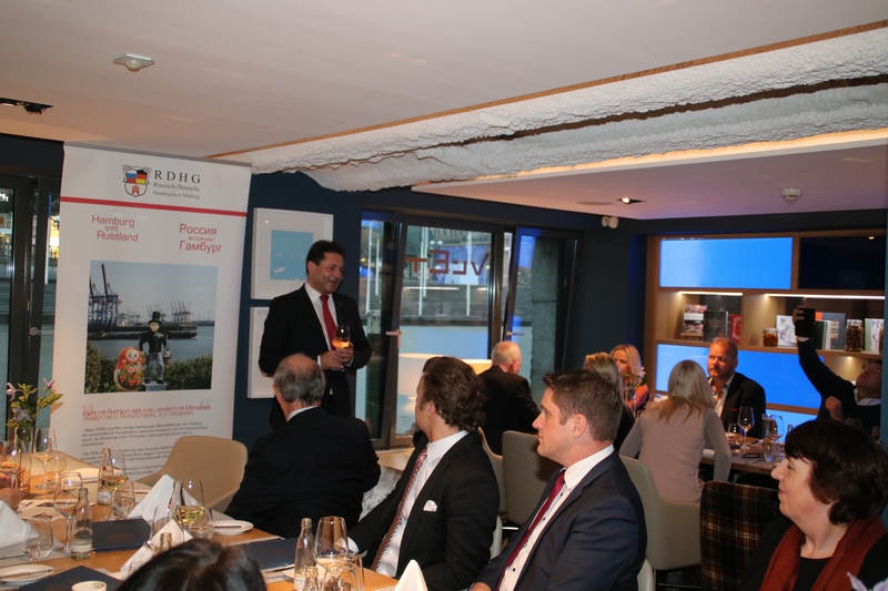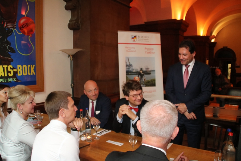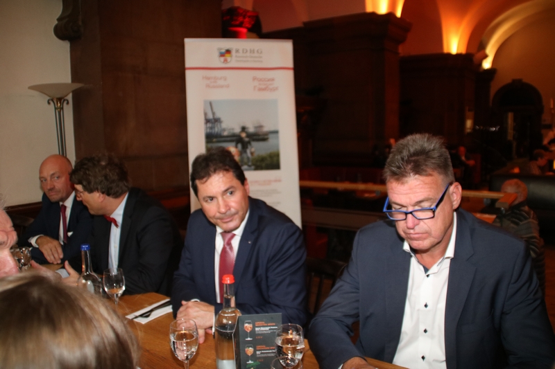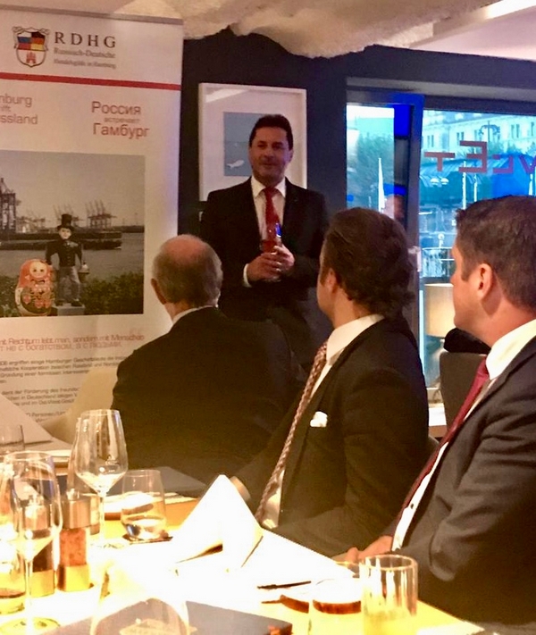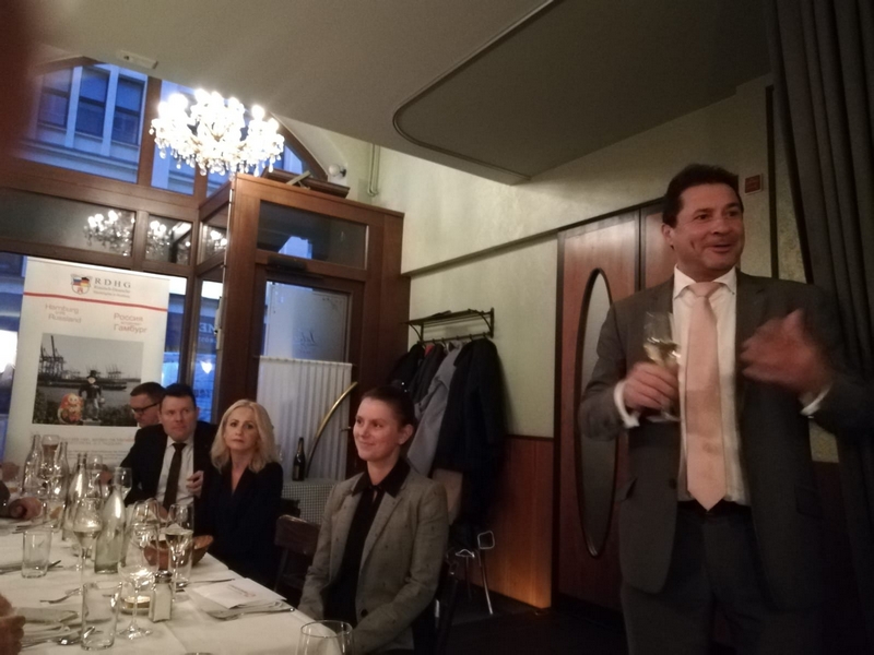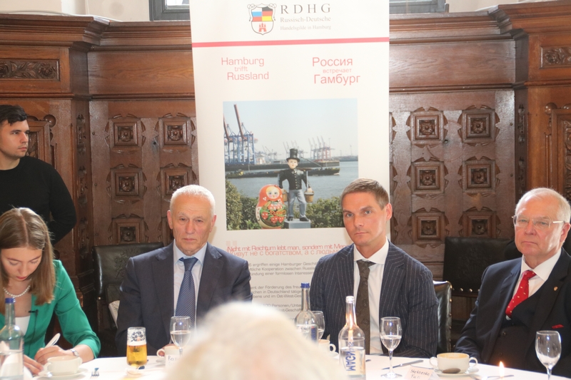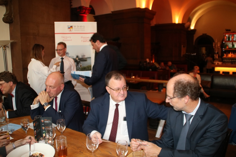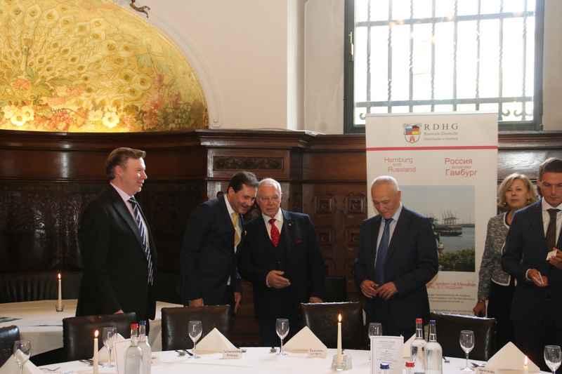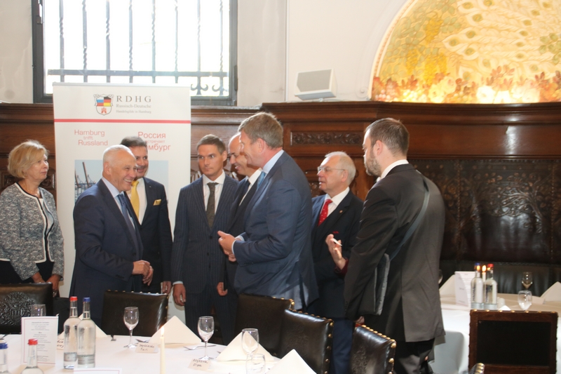 Der Staatssekretär der Staatenunion Russland-Belarus, Grigori A. Rapota, besuchte auf Einladung der Handelsgilde für einen Tag die Freie und Hansestadt Hamburg und präsentierte das spannende Projekt eines Hochgeschwindigkeits-Bahntransportkorridors zwischen Hamburg und St. Petersburg, quasi als Verlängerung der sich in der Planungsphase befindlichen Hochgeschwindigkeitstrasse zwischen Moskau und St. Petersburg. Über die Verlängerung nach Hamburg sprach er beim RDHG-Round-Table-Lunch „Logistics“ im Rathauskeller „Parlament“ mit rund 30 interessierten Unternehmensvertretern aus dem Logistikbereich und dem Finanzsektor.