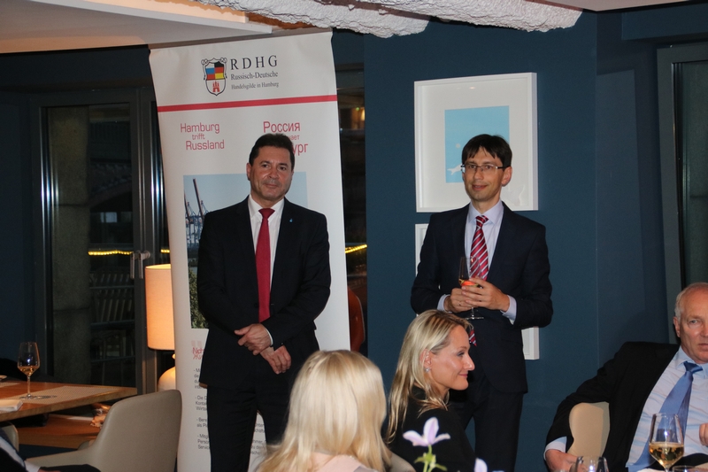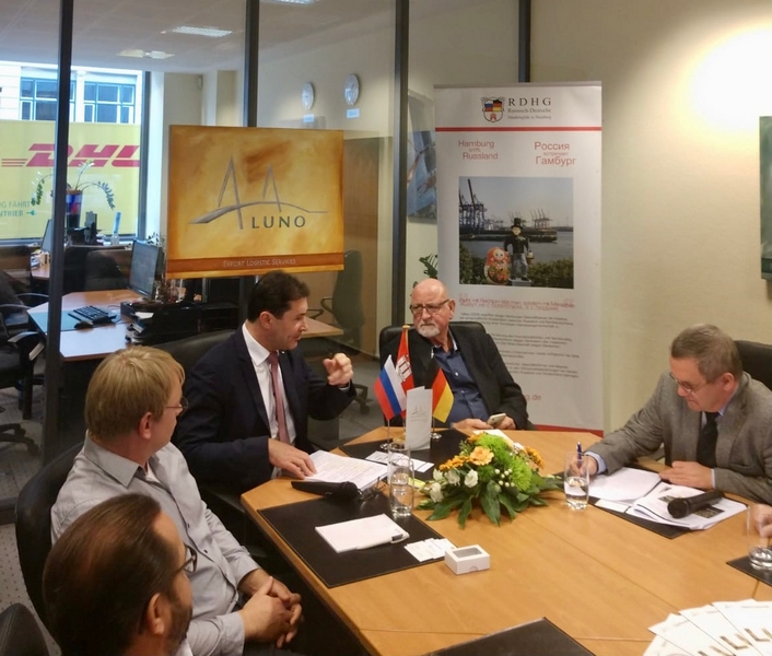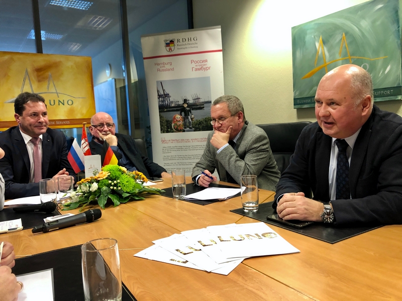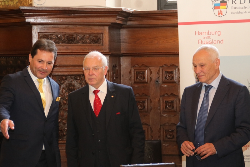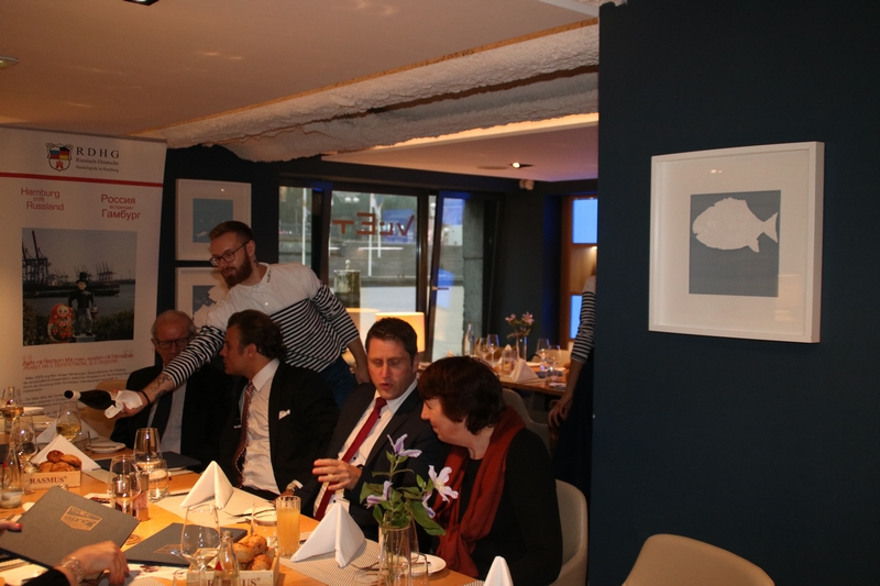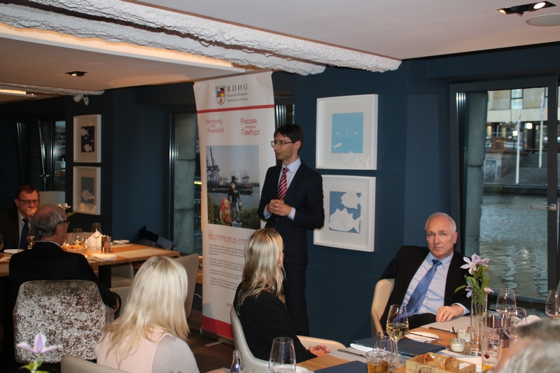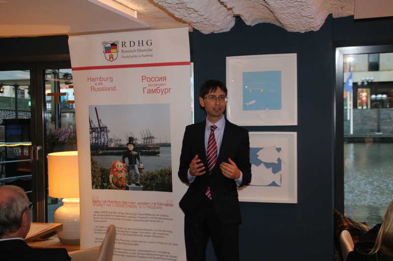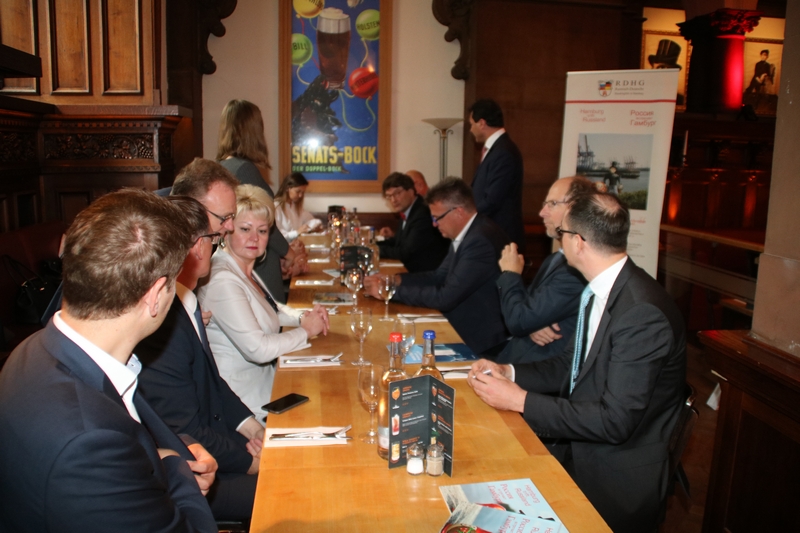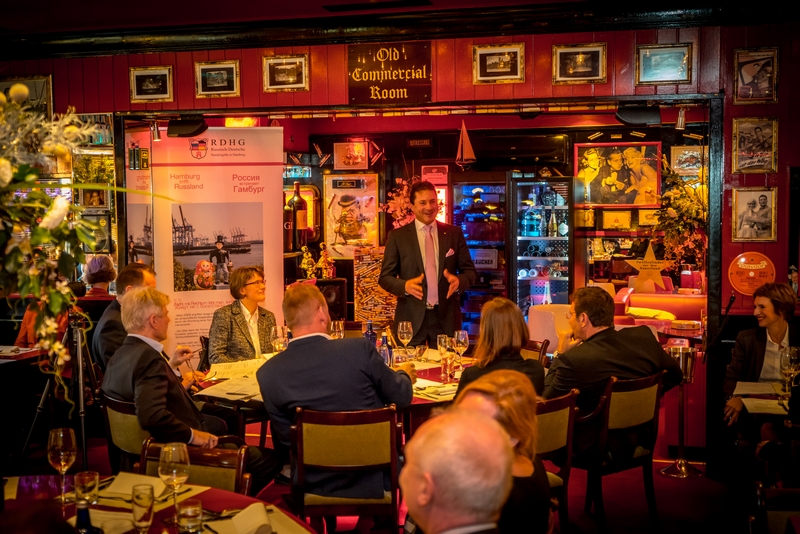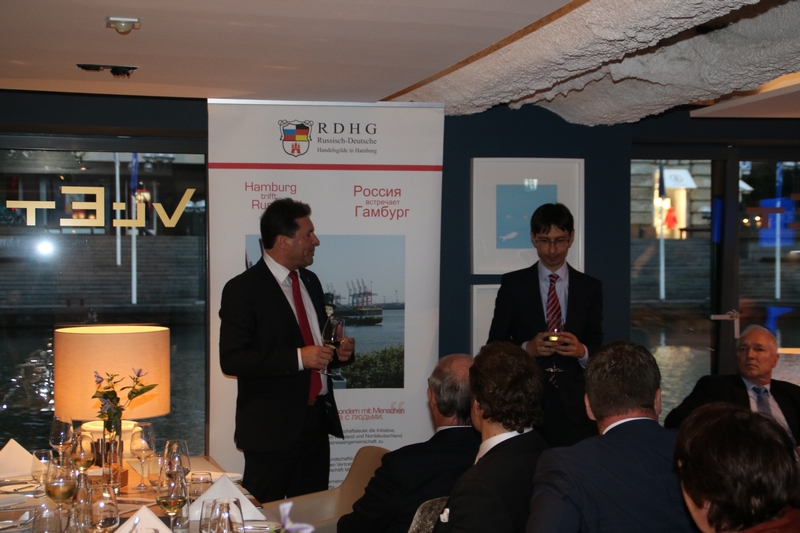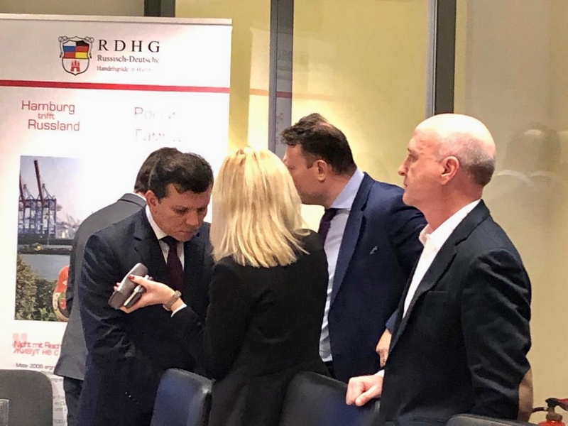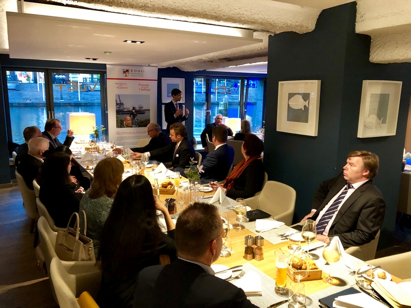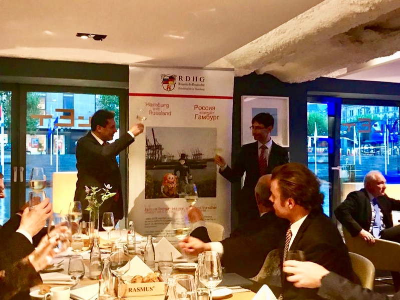 Der Staatssekretär der Staatenunion Russland-Belarus, Grigori A. Rapota, besuchte auf Einladung der Handelsgilde für einen Tag die Freie und Hansestadt Hamburg und präsentierte das spannende Projekt eines Hochgeschwindigkeits-Bahntransportkorridors zwischen Hamburg und St. Petersburg, quasi als Verlängerung der sich in der Planungsphase befindlichen Hochgeschwindigkeitstrasse zwischen Moskau und St. Petersburg. Über die Verlängerung nach Hamburg sprach er beim RDHG-Round-Table-Lunch „Logistics“ im Rathauskeller „Parlament“ mit rund 30 interessierten Unternehmensvertretern aus dem Logistikbereich und dem Finanzsektor.