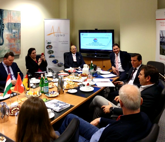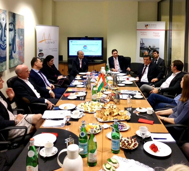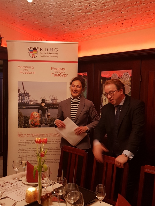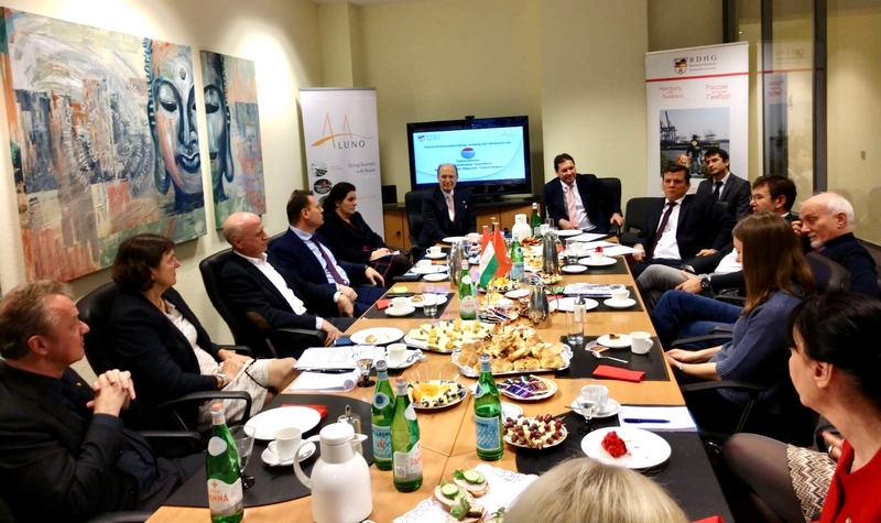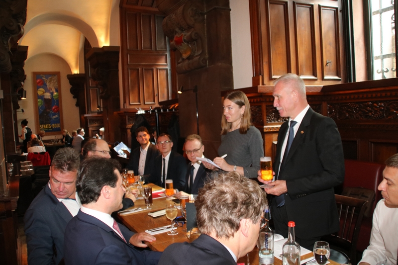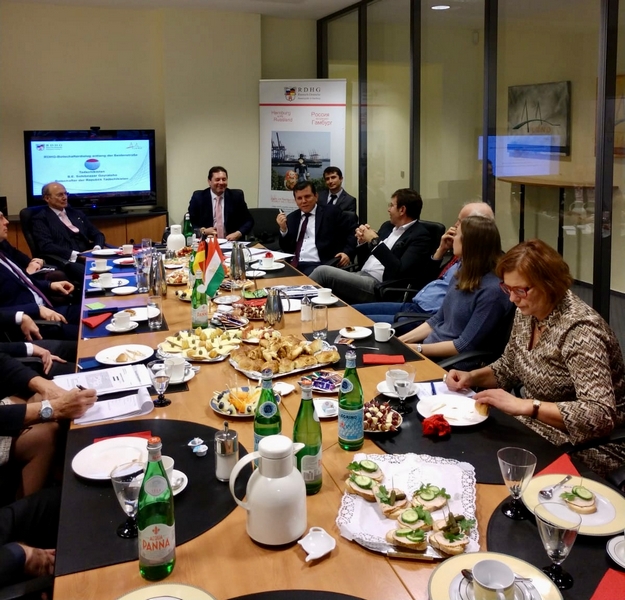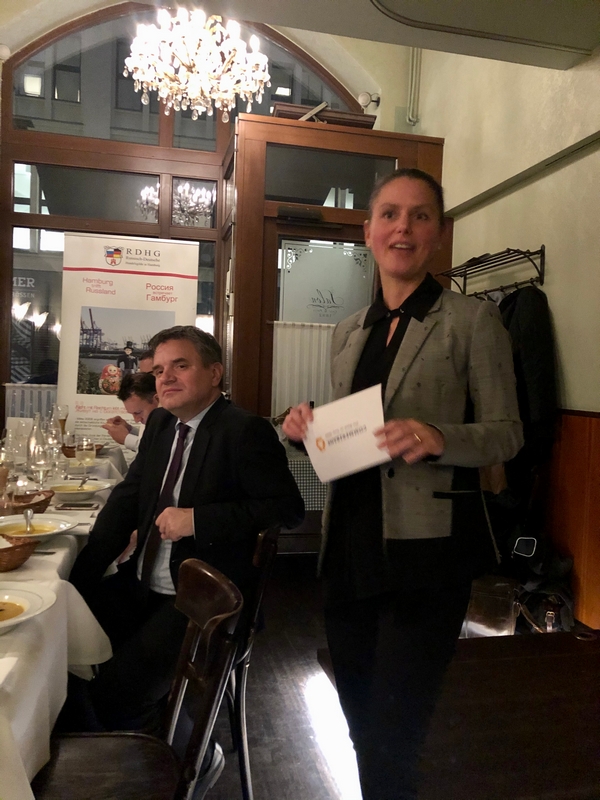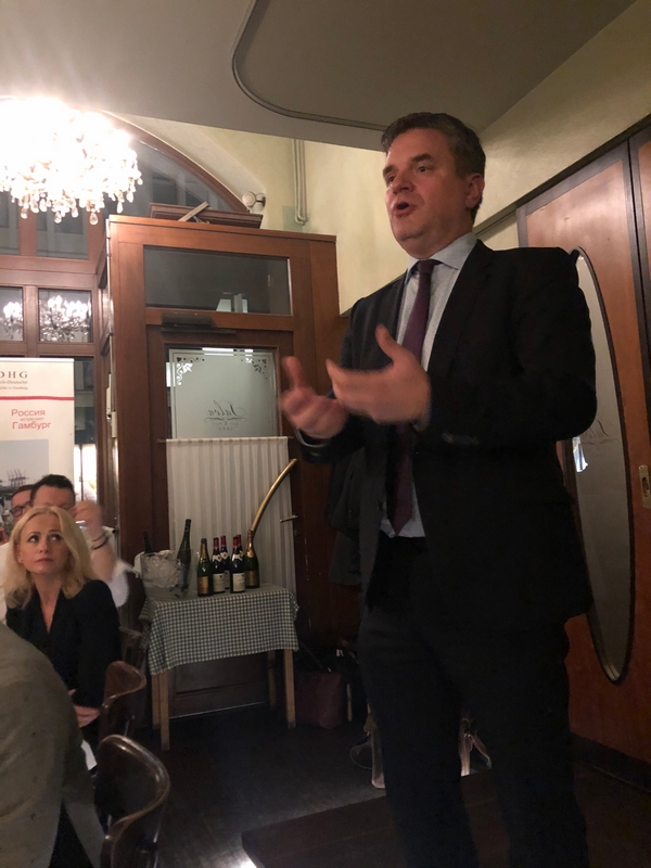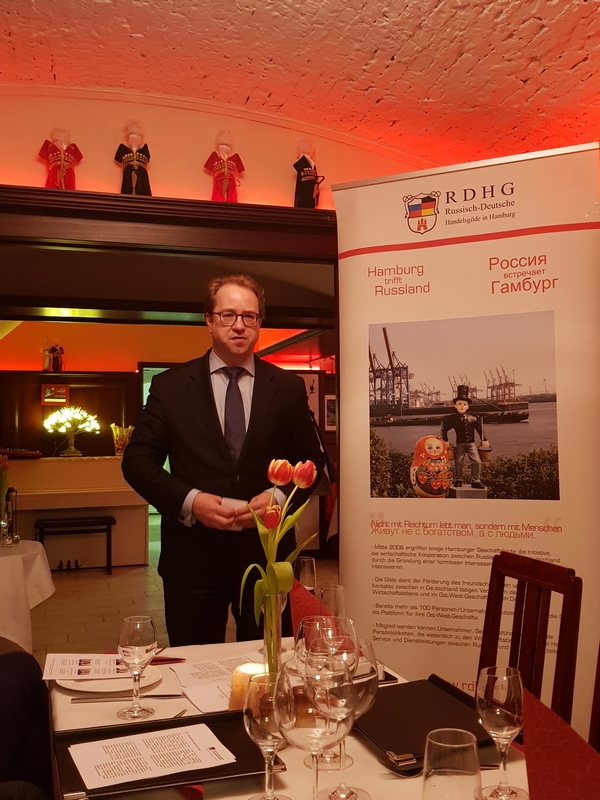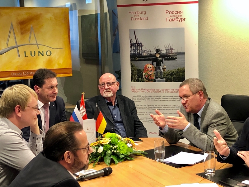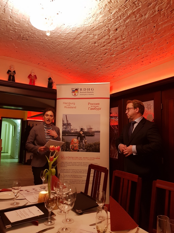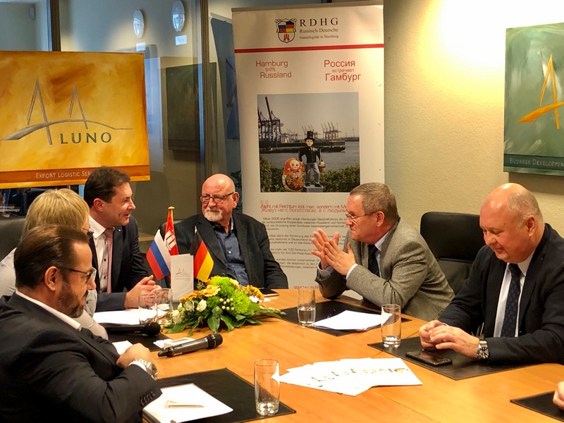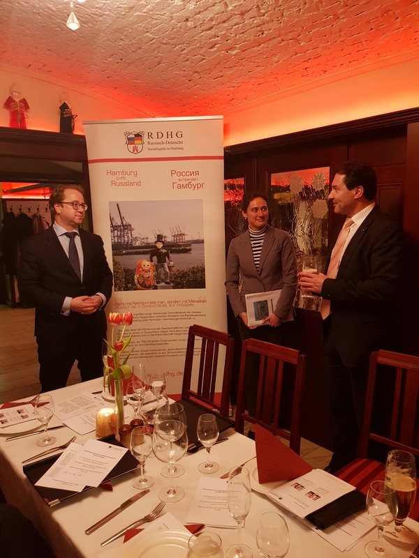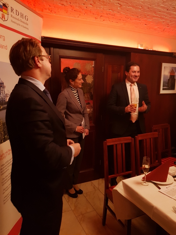 Der Staatssekretär der Staatenunion Russland-Belarus, Grigori A. Rapota, besuchte auf Einladung der Handelsgilde für einen Tag die Freie und Hansestadt Hamburg und präsentierte das spannende Projekt eines Hochgeschwindigkeits-Bahntransportkorridors zwischen Hamburg und St. Petersburg, quasi als Verlängerung der sich in der Planungsphase befindlichen Hochgeschwindigkeitstrasse zwischen Moskau und St. Petersburg. Über die Verlängerung nach Hamburg sprach er beim RDHG-Round-Table-Lunch „Logistics“ im Rathauskeller „Parlament“ mit rund 30 interessierten Unternehmensvertretern aus dem Logistikbereich und dem Finanzsektor.