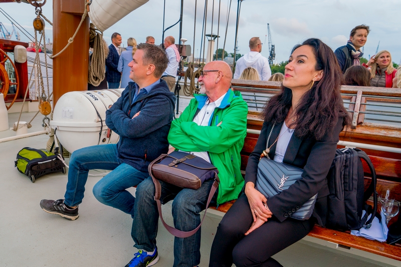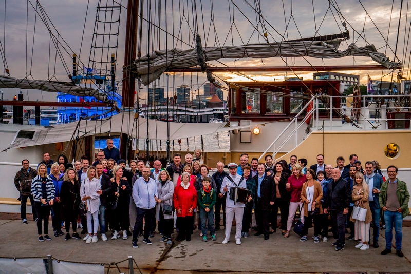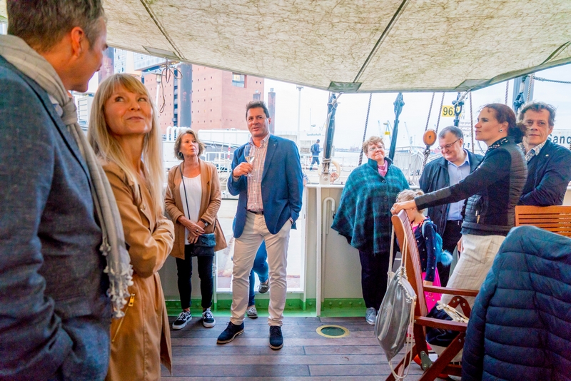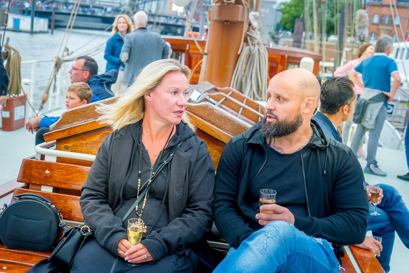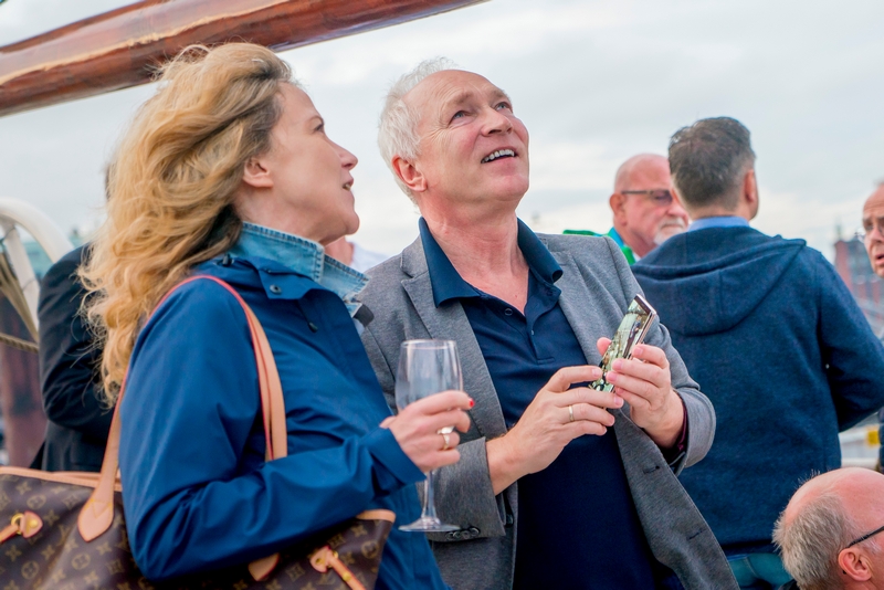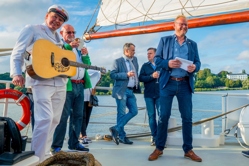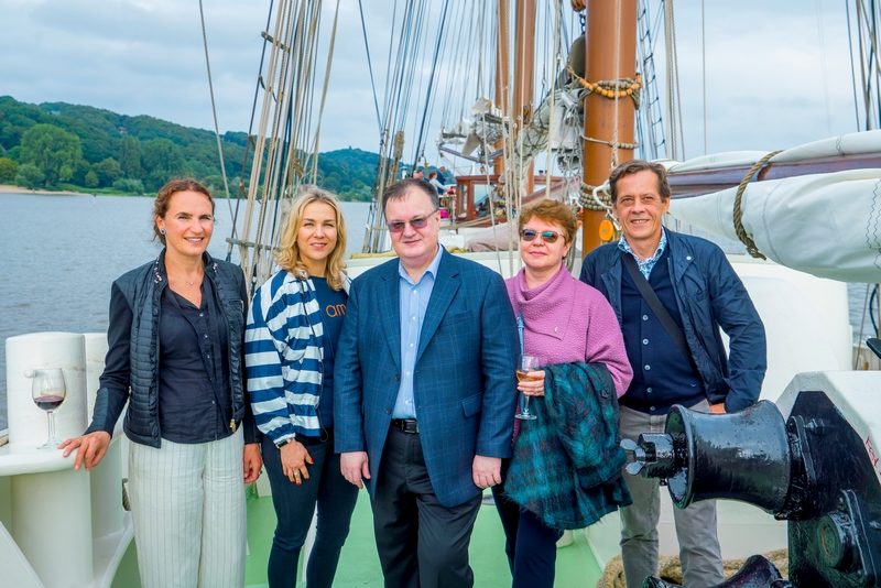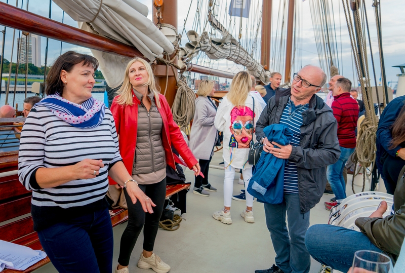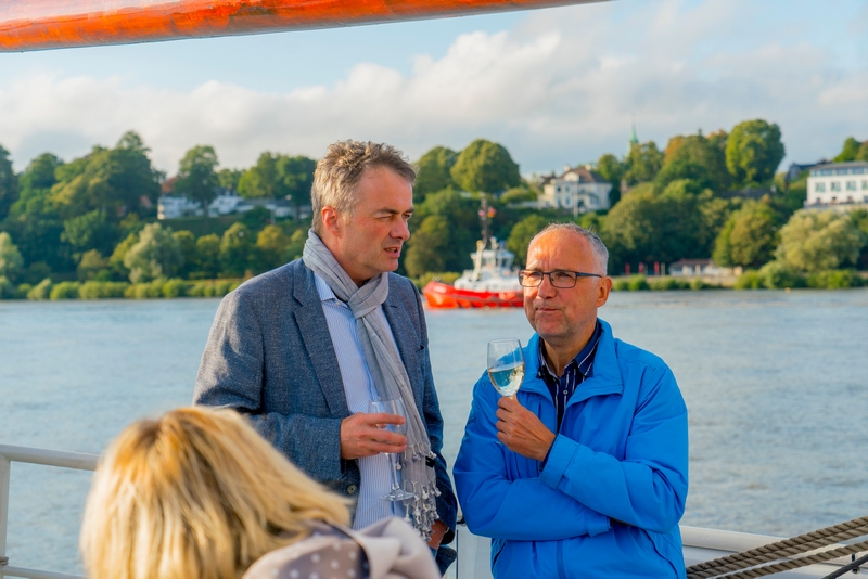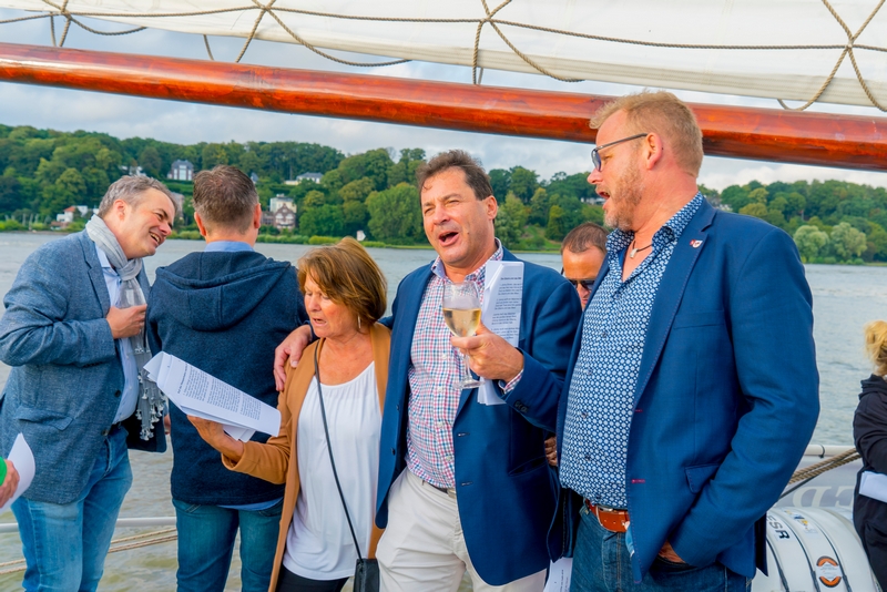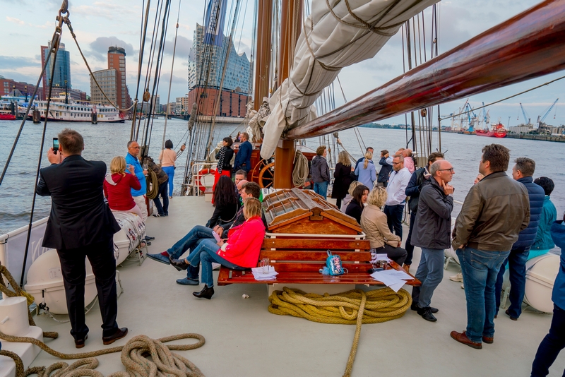 Wie auch im letzten Jahr lud die Handelsgilde auf vielfachen Wunsch zu einem fantastischen Segeltörn durch Hamburger Hafen und entlang der Elbvororte. Wir charterten für unser 12. Sommerfest den Dreimastschoner Mare Frisium unseres Mitglieds Hans-Christoph Klaiber von NordEvent. Das Schiff wurde 1916 unter niederländischer Flagge mit dem Namen Petronella zu Wasser gelassen, 1993 als Dreimastmastschoner neu hergerichtet und dient seit 1995 unter ihrem heutigen Namen als Passagiersegler. Die Mare Frisium ist 50 Meter lang, 6,7 Meter breit und weist mit einem Hauptmast von 31 Metern Länge eine Segelfläche von 634 Quadratmeter auf. Bei Rückkehr nach Hamburg haben wir die Segel gesetzt und sind bis an die Elbphilharmonie gesegelt. Ein tolles Erlebnis bei leckerem Essen, gutem Wein, einer sehr herzlichen und gemütlichen Atmosphäre an Bord mit viel Spaß, Gesang und Kommunikation im Gildekreis.