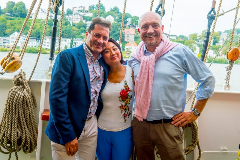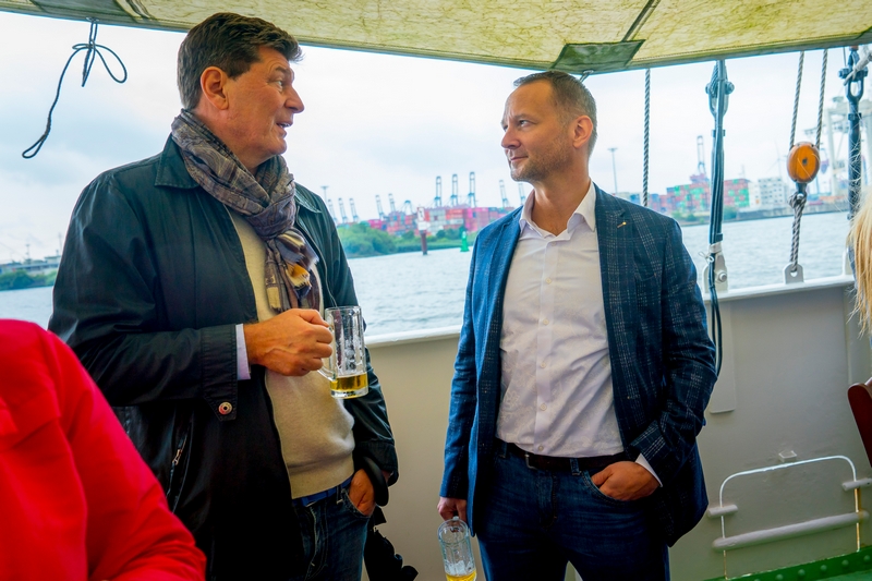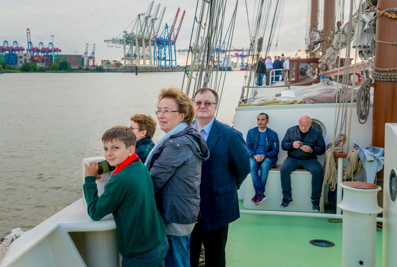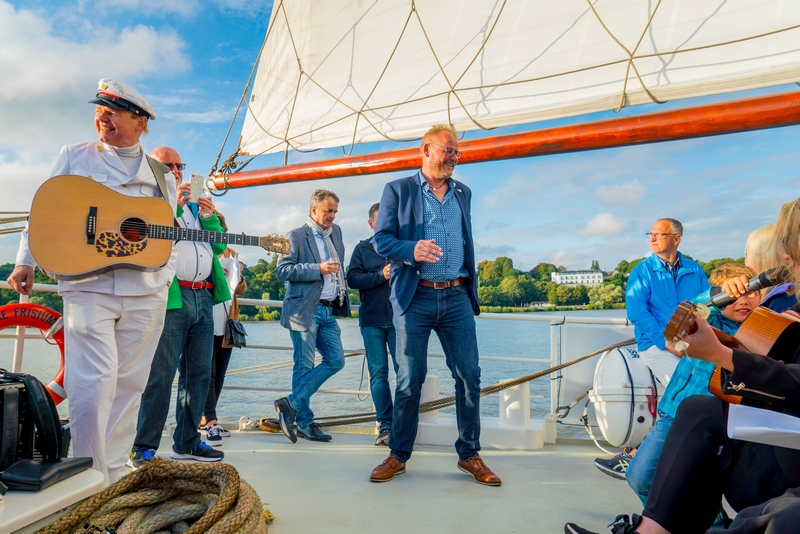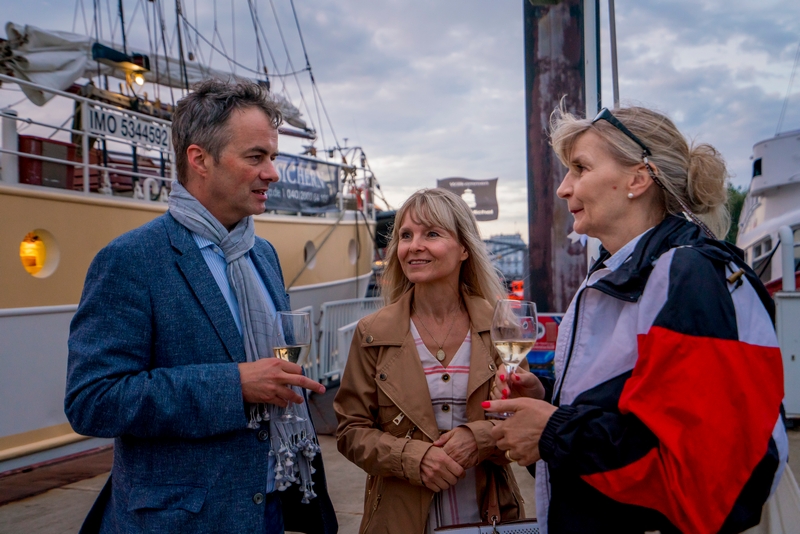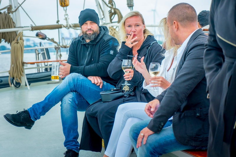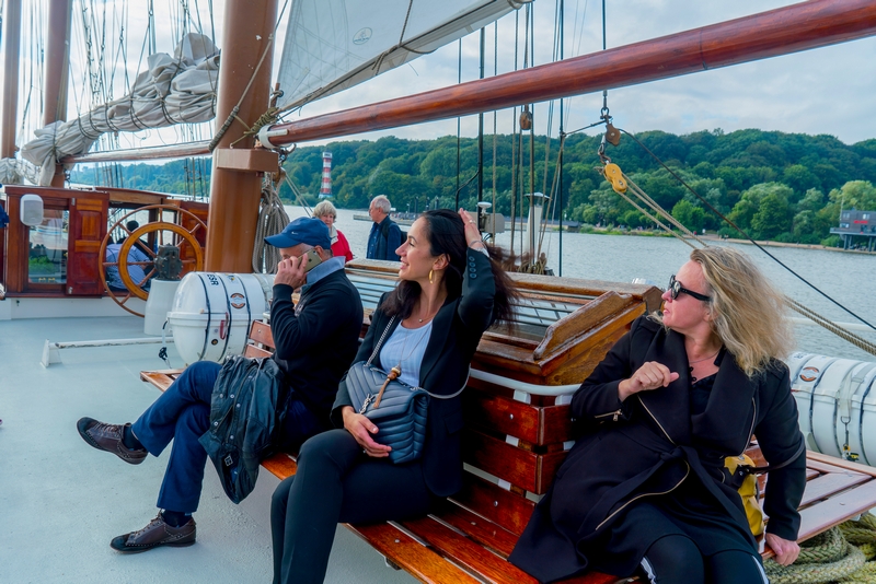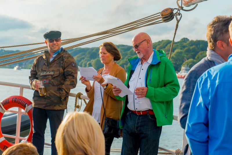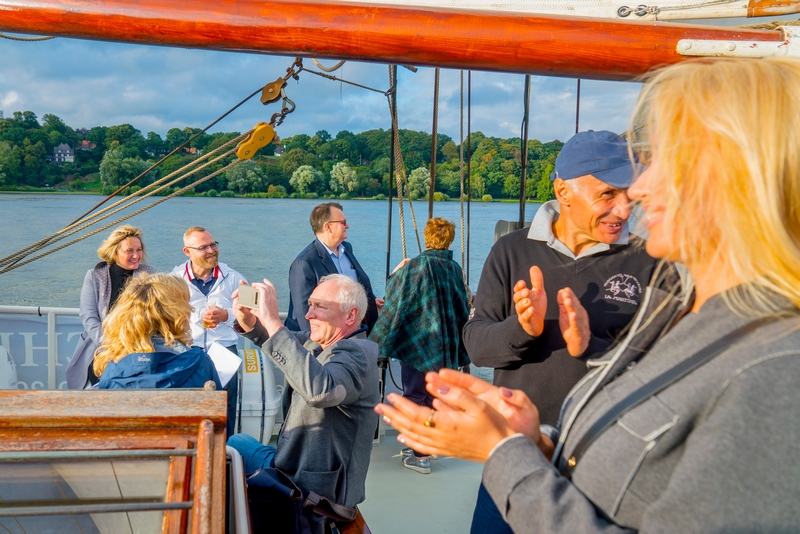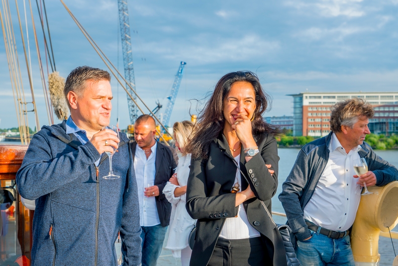 Wie auch im letzten Jahr lud die Handelsgilde auf vielfachen Wunsch zu einem fantastischen Segeltörn durch Hamburger Hafen und entlang der Elbvororte. Wir charterten für unser 12. Sommerfest den Dreimastschoner Mare Frisium unseres Mitglieds Hans-Christoph Klaiber von NordEvent. Das Schiff wurde 1916 unter niederländischer Flagge mit dem Namen Petronella zu Wasser gelassen, 1993 als Dreimastmastschoner neu hergerichtet und dient seit 1995 unter ihrem heutigen Namen als Passagiersegler. Die Mare Frisium ist 50 Meter lang, 6,7 Meter breit und weist mit einem Hauptmast von 31 Metern Länge eine Segelfläche von 634 Quadratmeter auf. Bei Rückkehr nach Hamburg haben wir die Segel gesetzt und sind bis an die Elbphilharmonie gesegelt. Ein tolles Erlebnis bei leckerem Essen, gutem Wein, einer sehr herzlichen und gemütlichen Atmosphäre an Bord mit viel Spaß, Gesang und Kommunikation im Gildekreis.